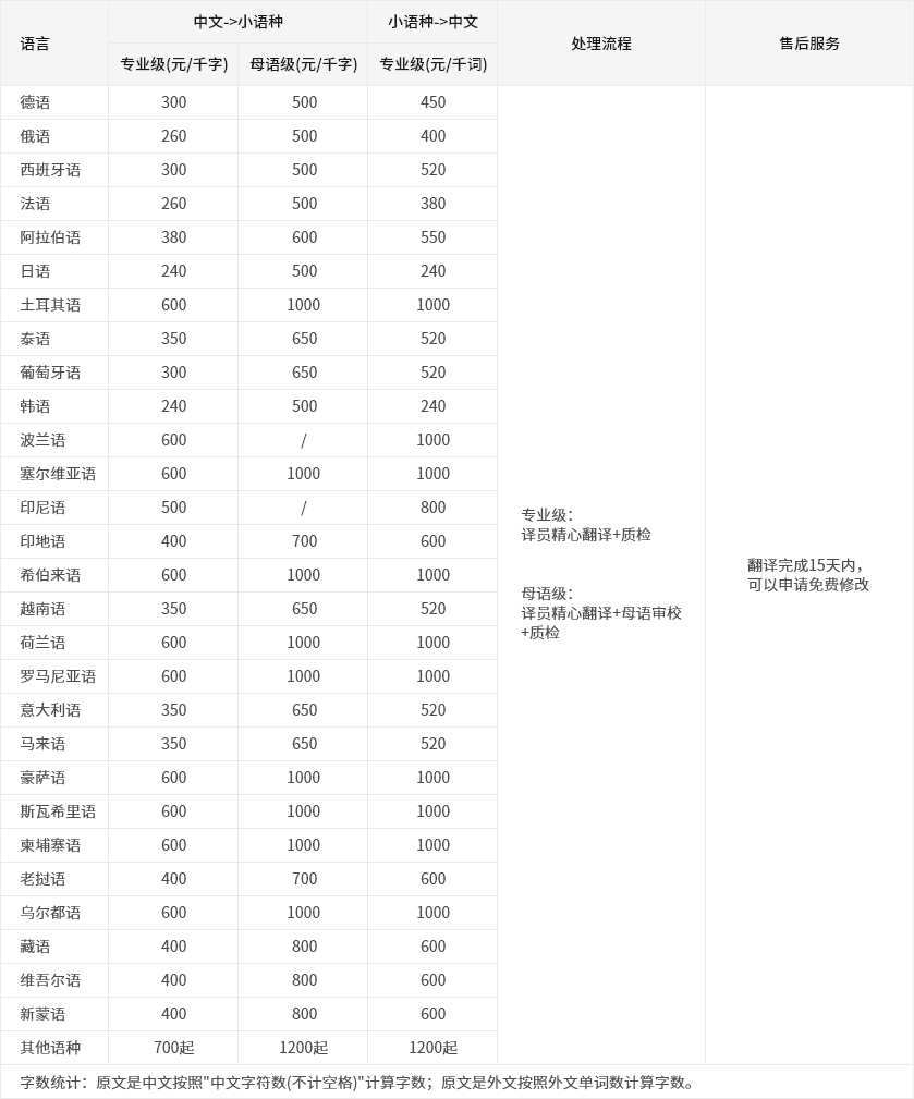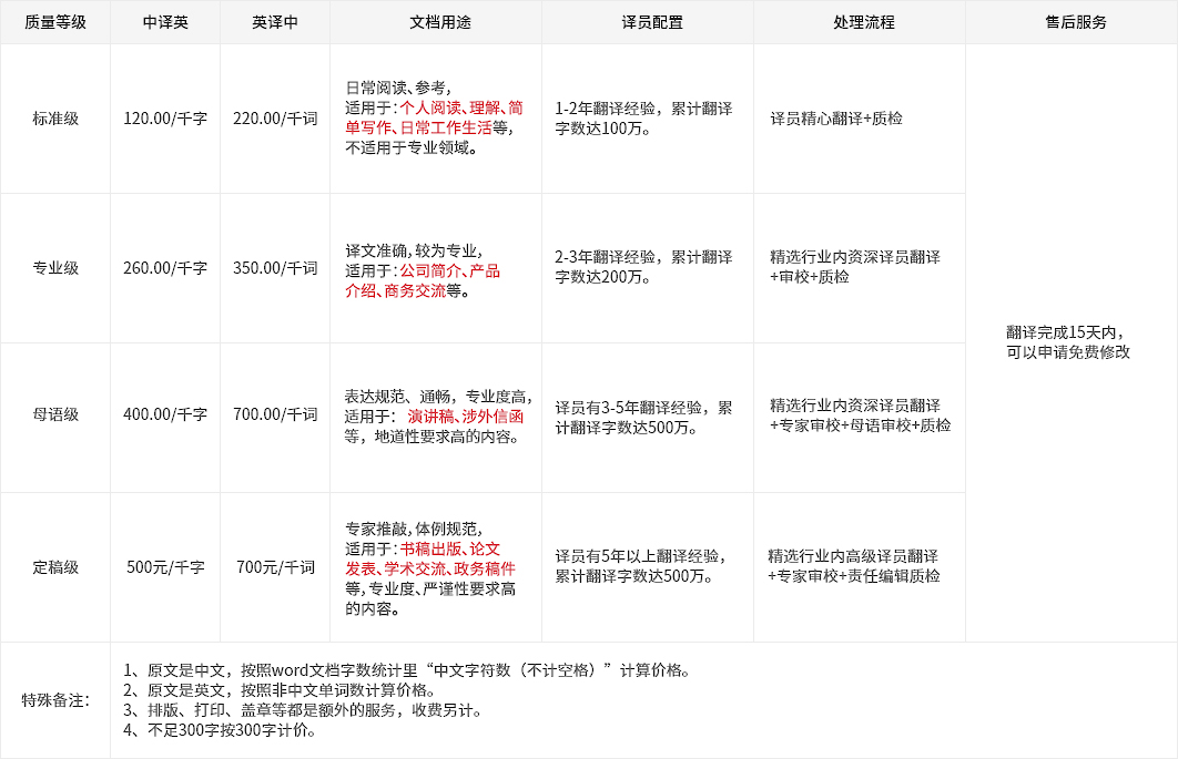 根据对翻译 内容用途、质量等级的要求,按照不同质量标准、不同语种 进行收费,如下: