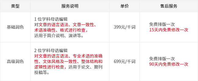 母语润色服务,对具有一定基础、可读性的英文稿件,提供在原文基础上进行专业母语润色、审校、质检服务。 由专业学科母语编辑提供稿件润色服务,改善语言质量,提升表达效果,可助力SCI论文成功发表。